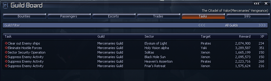 As well as missions, you can also get various tasks from the different guilds, these tasks are found on the Guild Board which you can access via any Trading Station (as well as the Guild Headquarters).